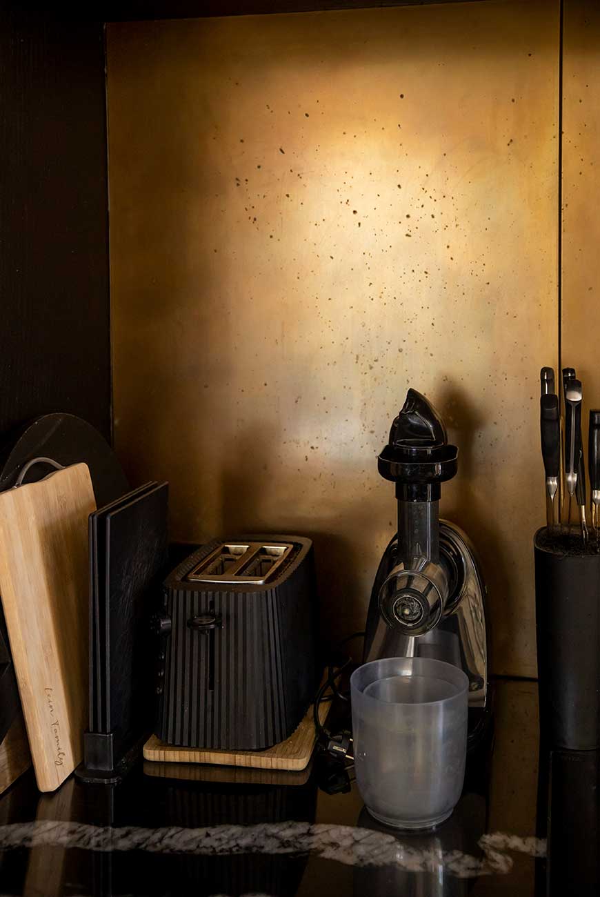 Messing is een legering van koper en zink en staat bekend om zijn warme, goudkleurige look én is nog steeds niet weg te denken uit menig interieur. In de keuken werkt een messing achterwand perfect als eyecatcher, vooral wanneer je de keukenkasten, zoals hier bij Lotte, zwart doet. Een witte of zwarte keuken krijgt meteen meer karakter door de glanzende achterwand, en ook in een donkere keuken zorgt messing voor een chique contrast. Bovendien past het bij veel stijlen: van strak en modern tot industrieel of zelfs klassiek.
